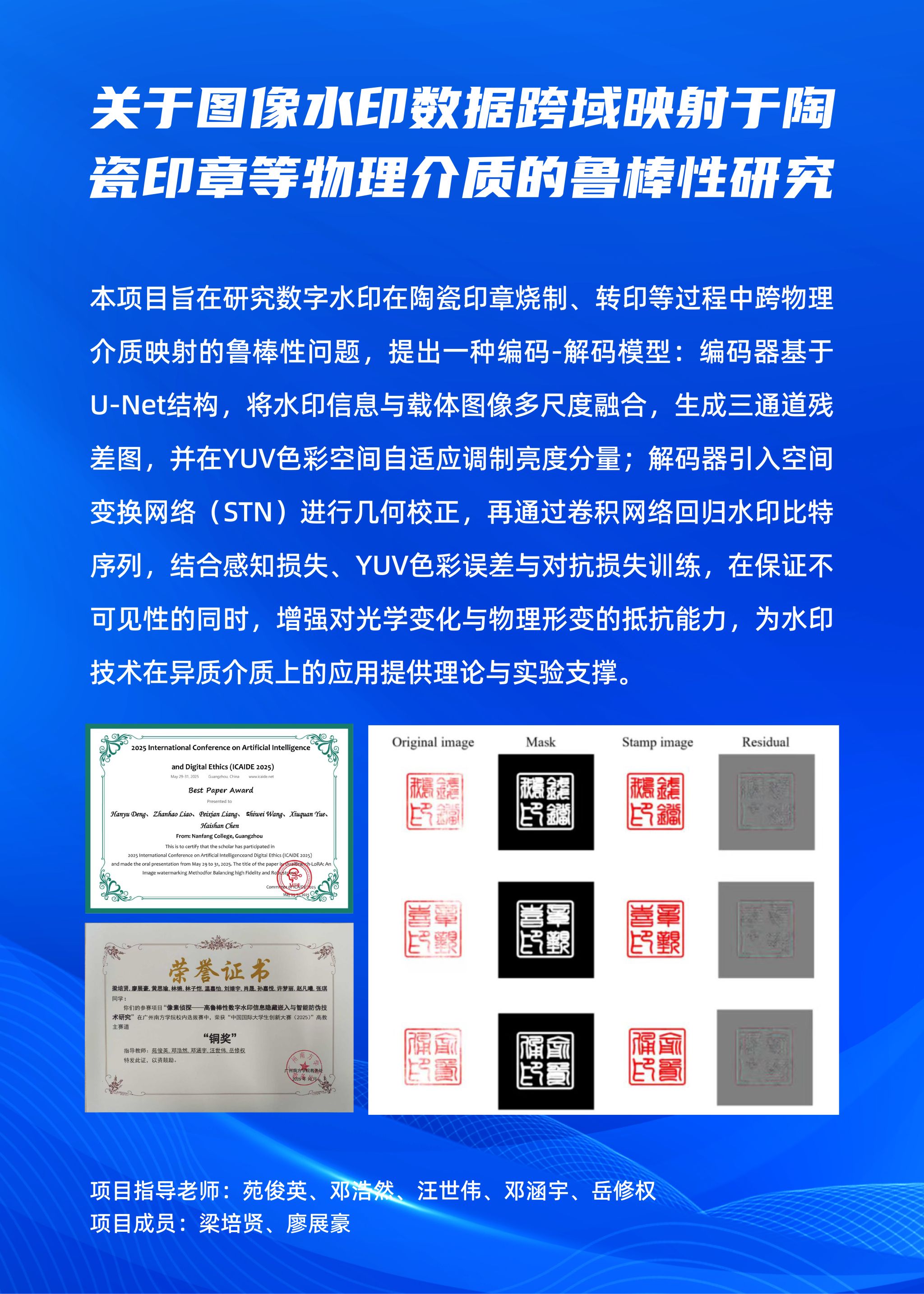 简介:本研究聚焦于解决数字水印在跨物理介质映射过程中的鲁棒性难题,特别是在陶瓷印章的烧制、转印与成像环节。核心在于构建编码-解码模型,编码器基于U-Net架构,将待隐藏的信息经全连接层扩展后,与载体图像的特征图进行多尺度深度融合,生成一个优化的三通道残差图,该残差图在YUV颜色空间中对亮度分量进行自适应调制,解码端为应对物理变形引入了空间变换网络(STN),对采集到的图像进行几何校正与对齐,再通过轻量级的卷积序列来回归水印信息的比特概率,最终经由Sigmoid函数与阈值化处理恢复出二值序列。模型训练采用了感知损失(LPIPS)、YUV色彩空间的加权误差以及对抗性损失策略,共同约束模型在保证水印不可见性的同时,提升其抵御复杂光学环境与物理形变的能力。本研究为水印技术在陶瓷等异质介质上的适应能力提供了详实的理论分析与实验验证。