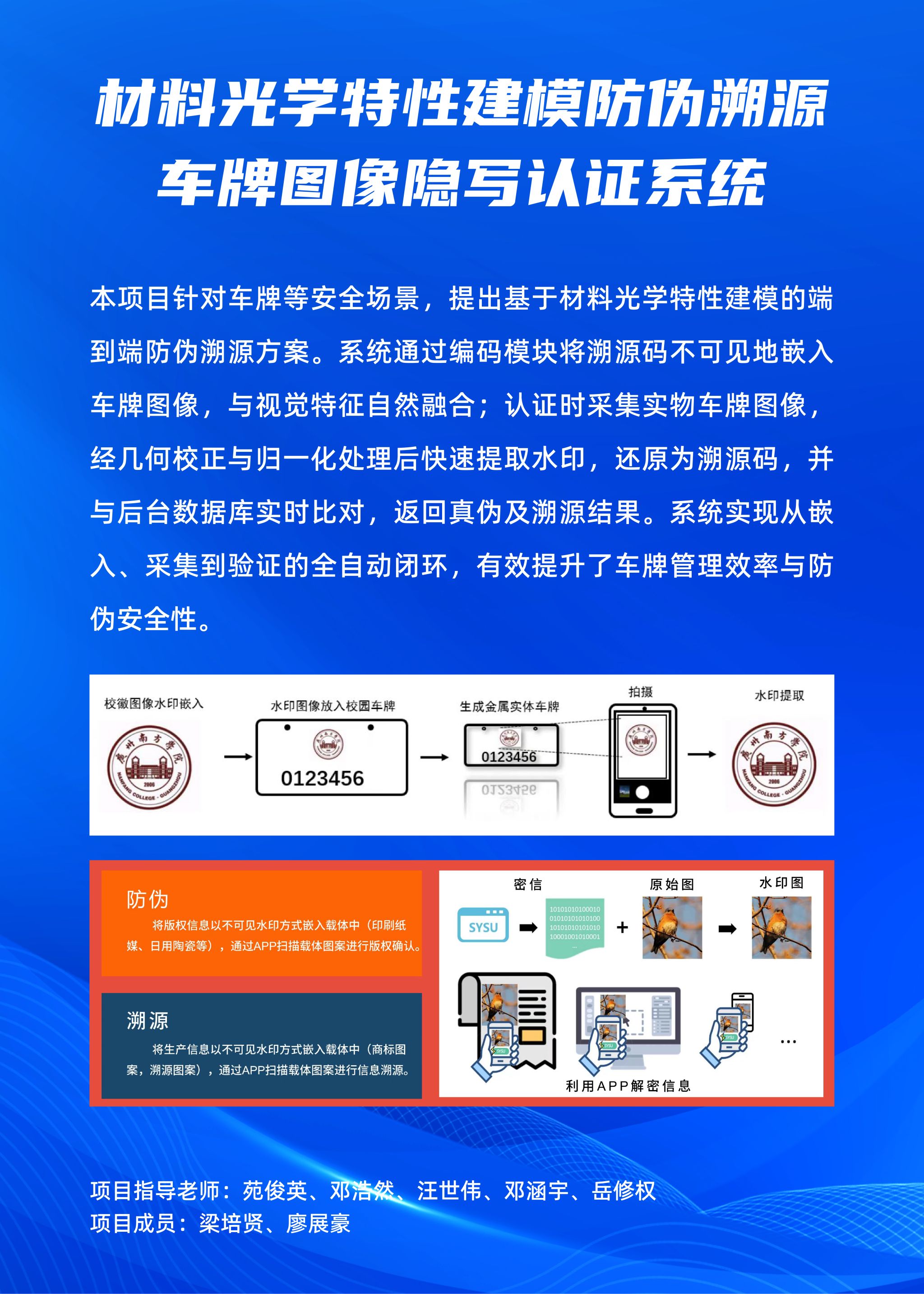 简介:本系统为材料光学特性建模的端到端防伪溯源提供了解决方案,专为车牌等高安全需求场景设计。系统使用内置编码模块,将溯源码等结构化信息不可见地嵌入到车牌图像中,使其与车牌的整体视觉特征(如徽标、字符)自然融合。当需要对实物车牌进行认证时,用户通过指定程序采集车牌图像并上传。系统服务器接收到图像后,自动触发解码流程:先对图像进行几何畸变校正与位置归一化处理,然后快速提取出隐藏的数字水印,并将其还原为原始的溯源码。该码值将与后台数据库中的备案信息进行实时比对与映射,最终向用户返回明确的认证结论(如真伪、溯源信息等)。整套系统流程自动化,无需人工干预,实现了从信息嵌入、实物采集到在线验证的完整业务闭环,有效提升了车牌的管理效率与防伪安全等级。